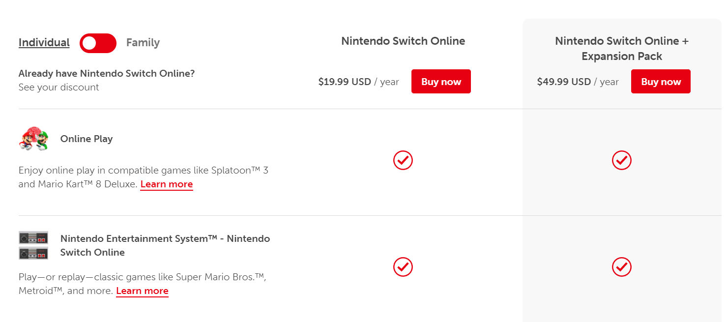 اشتراك عائلي (Family) والمتاح لـ 8 أفراد في أقصى حد له، متاح بسعر 49.99$ سنويًا ( يأتي مع الـ Expansion Pack ). وهو اشتراك جيد للأشخاص الذين لديهم أكثر من جهاز نايتندو ويريدون الحصول على كافة ميزات اللعب أونلاين وتجربة الألعاب والخدمات.